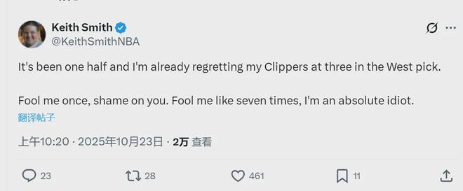 快船主帅泰伦卢赛后说道:“我们打得像屎一样,输球的责任在我!”NBA记者Keith Smith在中场休息时发推点评:“骗我一次,是你可耻;骗我七次,是我愚蠢!之前我预测快船能排西部第三,现在的我就是个彻彻底底的大傻瓜!”