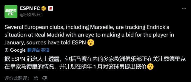 据ESPN报道,马赛已就恩德里克一月租借的可能性向皇马进行了初步询问,且这并非皇马收到的唯一一份问价。皇马预计在冬窗前还会有更多类似的接触。事实上,今年夏天皇马就曾建议恩德里克外租寻找机会,但球员本人坚持留下,争取在阿隆索麾下获得机会。